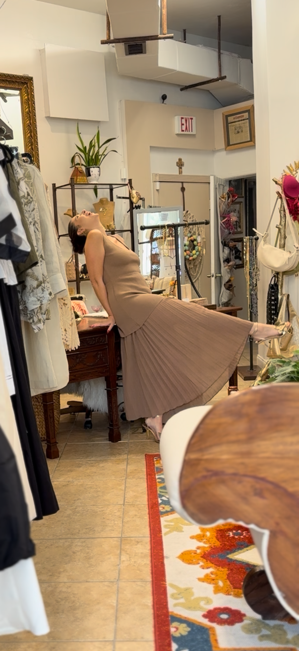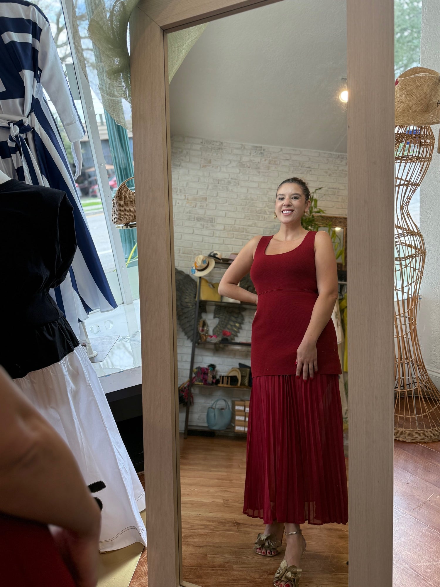 This versatile midi dress combines a cozy knit tank top with an airy, knife-pleated chiffon skirt that moves gracefully with each step. The stretchy bodice offers gentle shaping for a smooth silhouette, while the skirt adds elegant flow. Available in refined Merlot and soft Mocha, it’s perfect for a range of occasions from dinners to holiday gatherings. Pair with metallic sandals for warm days, or layer with a blazer and boots as temperatures cool.