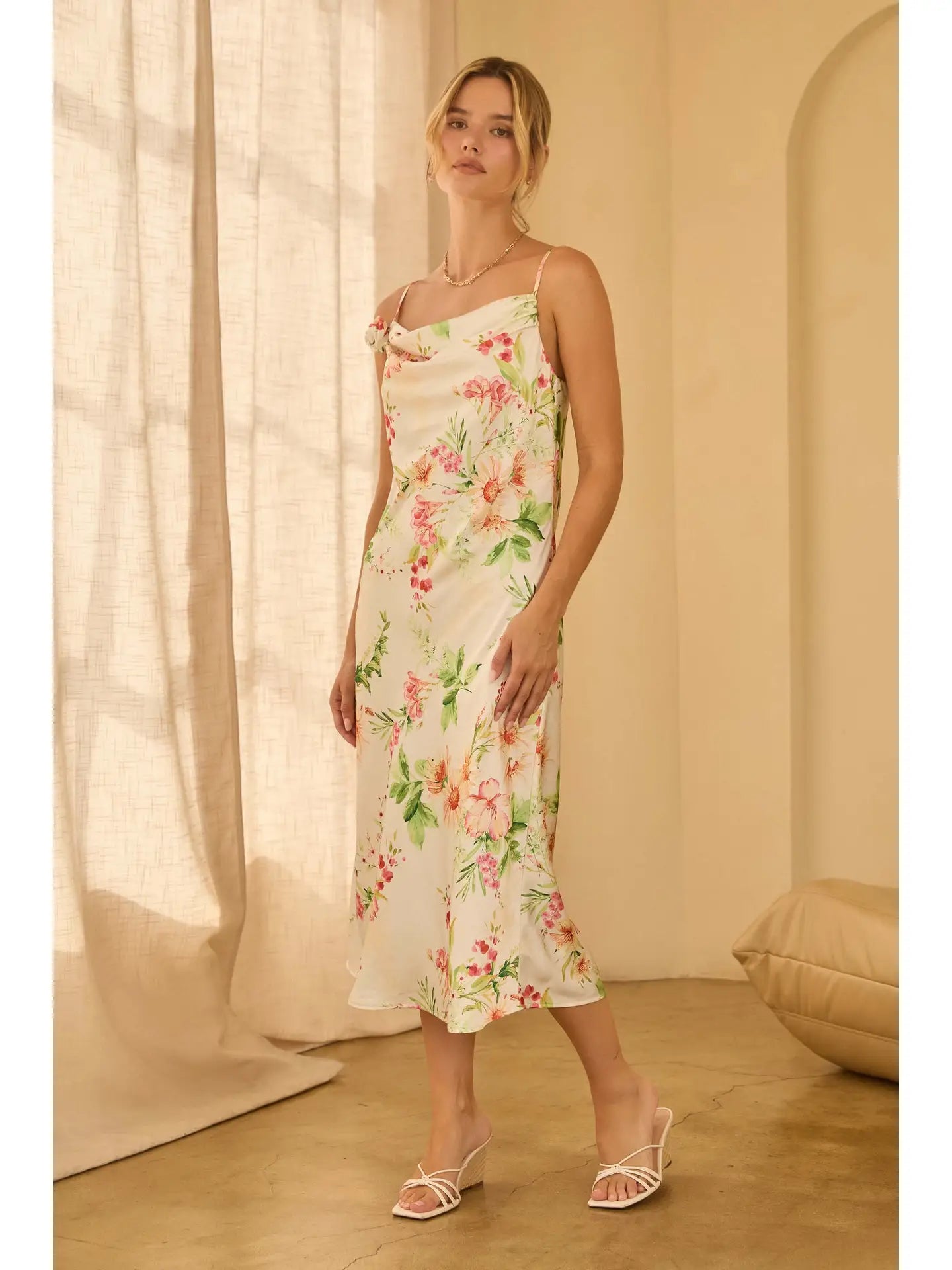 Elevate your evening repertoire with this sophisticated slip dress, featuring a graceful cowl neckline and delicate rosette detailing. The expertly draped neckline creates a flattering, fluid silhouette that moves with refined ease, while the romantic rosette accent introduces contemporary elegance. Constructed from lightweight, smooth fabric, this piece delivers effortless versatility—equally at home at intimate dinners, cocktail events, or upscale casual occasions. The thoughtful design balances understated luxury with modern sensibility, making it an essential addition to any curated wardrobe.