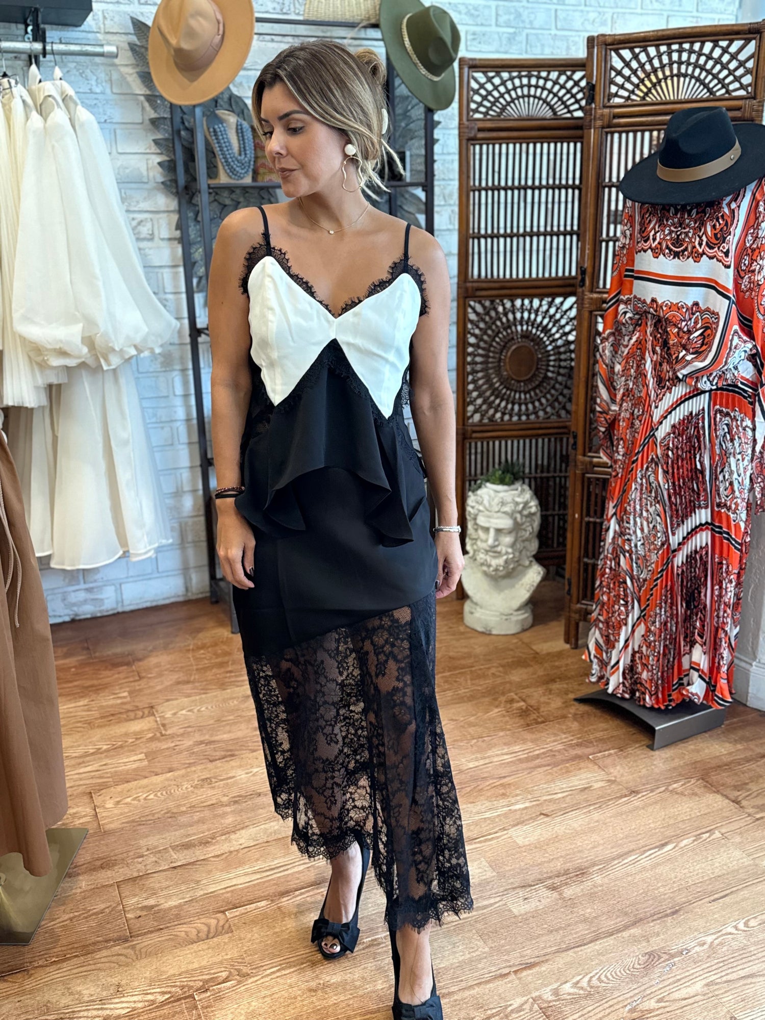 This exquisite lace set combines timeless elegance with bold contrast. Delicate black lace overlays creamy white satin, creating a striking visual interplay that flatters the silhouette. The intricate lace detailing provides texture and dimension, while the smooth satin base ensures comfort and a luxurious feel against the skin. Designed with refined craftsmanship, this set delivers sophisticated allure perfect for those who appreciate quality intimates with dramatic flair.