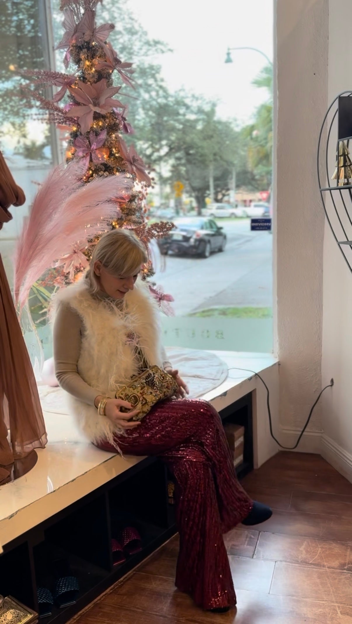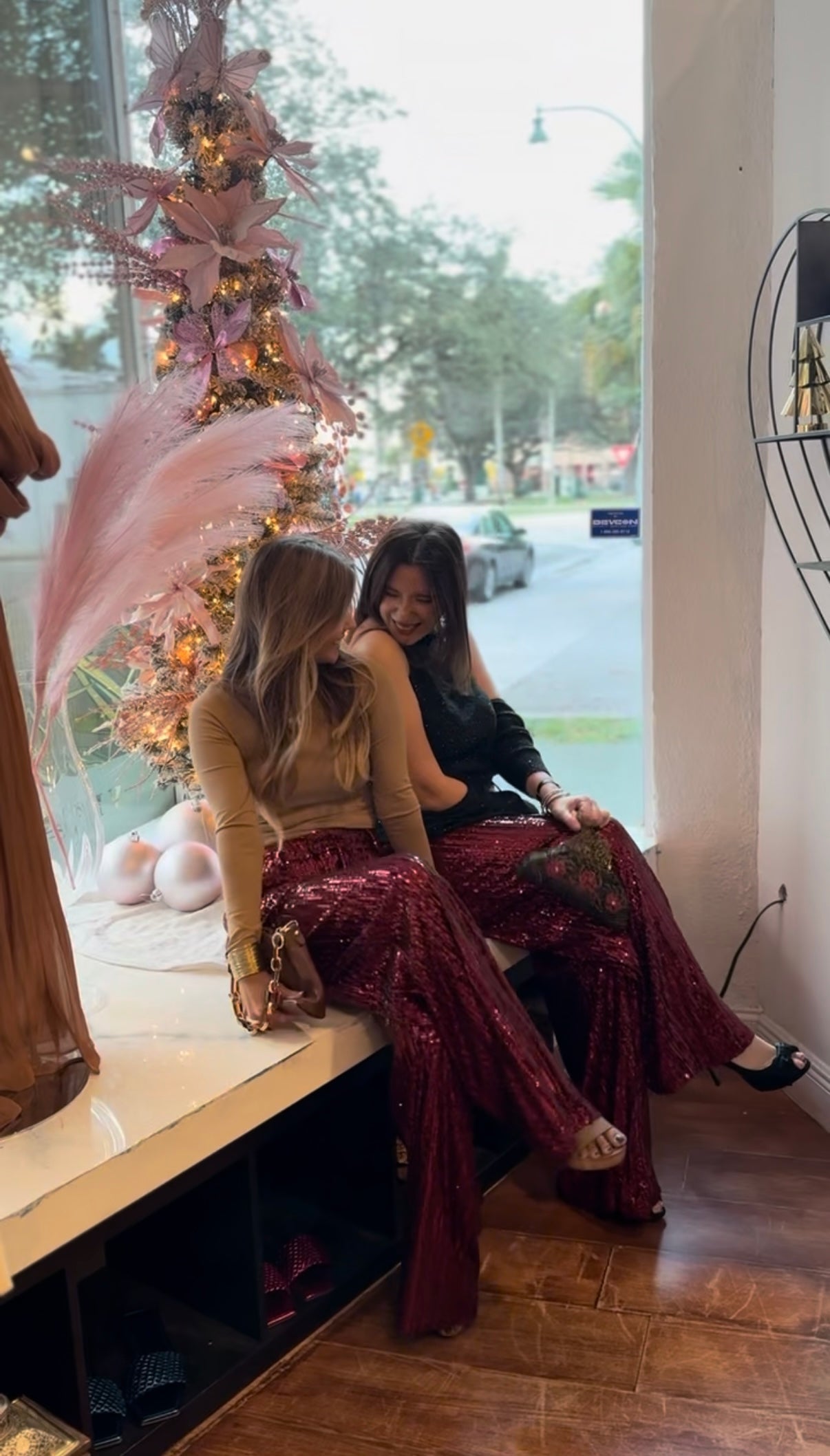 Steal the spotlight in these stunning ruby sequin trousers that command attention from every angle. The deep, jewel-toned shimmer flatters all skin tones while delivering instant festive glamour. Designed with a forgiving stretch waistband and gracefully flowing legs, they balance showstopping style with all-night comfort. Whether paired with a minimalist sweater for understated elegance or a bold statement top, these pants are the hero piece your holiday wardrobe needs. Perfect for celebrations, parties, or any occasion where you want to make an unforgettable impression.